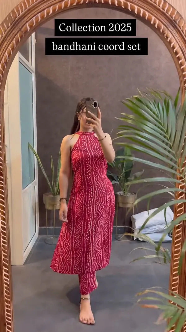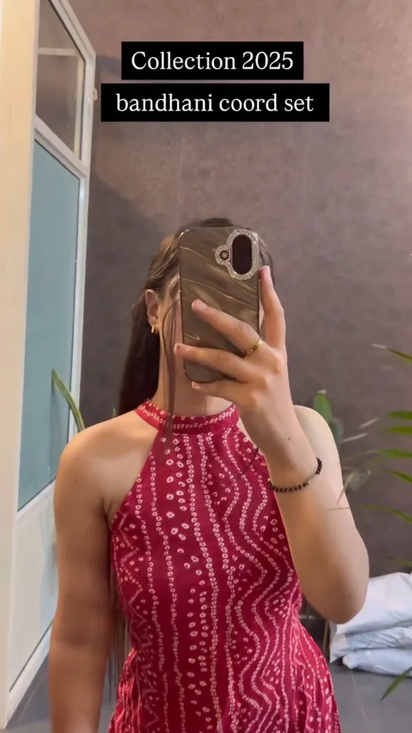 Festive Fusion Crimson Red Bandhani Halter Coord Set