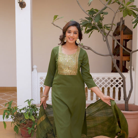 Moss-Green Tissue With Floral Print and Embroidery Kurta Set
