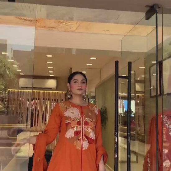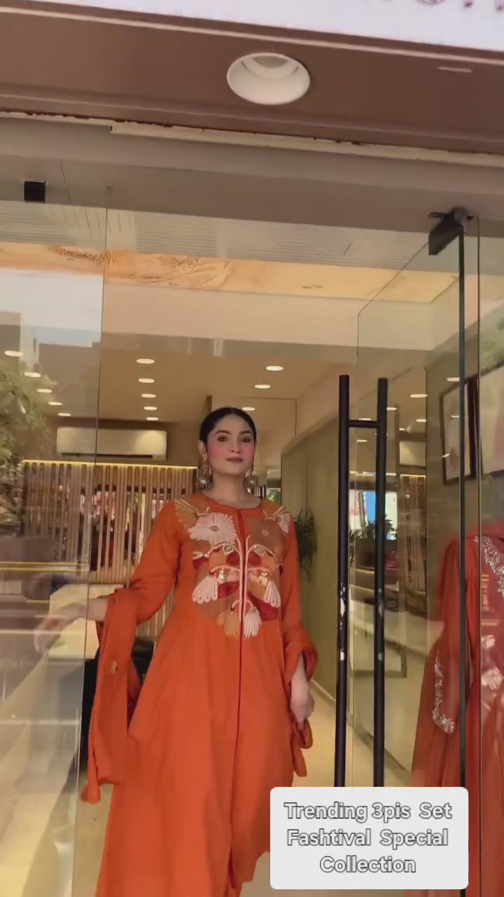 Orange Chanderi Silk Heavy Thread Embroidery Work Kurta Pant Set