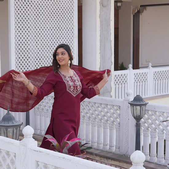 Skylee Maroon Rayon Blend Embroidered Kurta Set With Dupatta