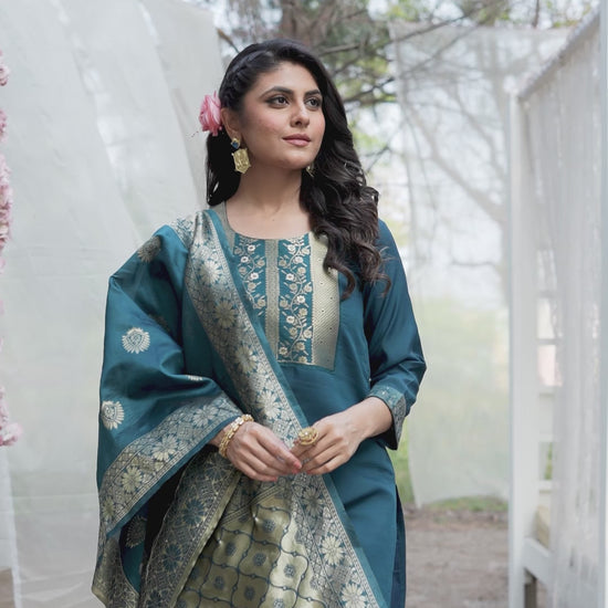 Women's Teal Rayon Slub Jacquard Straight Round Kurta Set